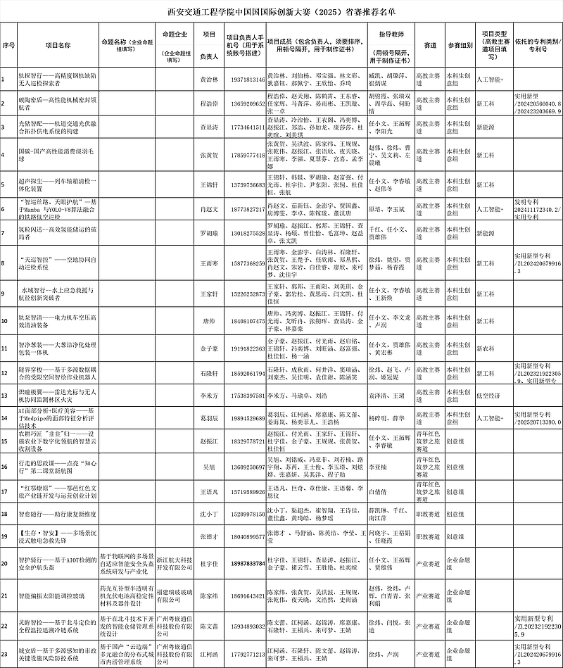 西安交通工程学院中国国际大学生创新大赛(2025)校级决赛已经顺利举行。经过各二级学院遴选、创新创业学院组织专家评审,共推荐23个项目进入省级复赛。其中主赛道14项、青年红色筑梦之旅赛道3项、职教赛道2项、产业赛道4项,共计23项。现将具体名单予以公示,详见附件。