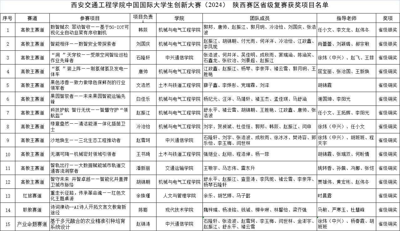 近日,中国国际大学生创新大赛(2024)陕西赛区省级复赛已落下帷幕。参赛项目经网络评审、路演答辩评审和会议评审,产生了各赛道获奖项目,获奖项目已在教育厅官网公示,现已过公示期。在本届大赛中我校参赛师生充分发挥百折不挠、锐意进取的精神,精心准备、反复打磨,共获省赛银奖2项,铜奖13项,产业命题赛道实现从“0”到“1”的突破。其中,我校《数智赋农翠动智收——基于5G-IOT可视化全自动韭菜有序收割机》和《智能相伴——数智安全带探索者》两个项目在本次大赛中斩获省赛银奖,《“洞 ”天穿梭——受限空间智绘巡检作业先锋者》等13个项目在本届大赛获得省赛铜奖。