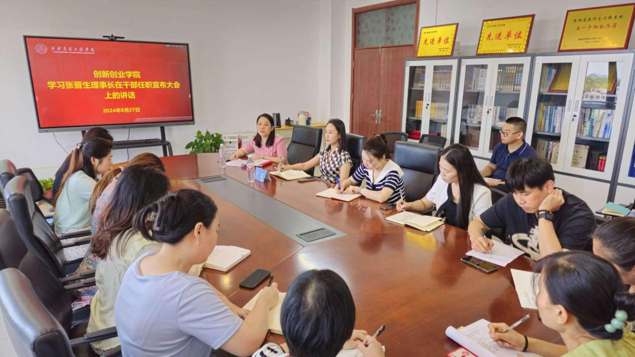 8月27日上午9点创新创业学院于行政楼516会议室召开学习理事长在干部任职宣布大会上的讲话会议,会议由理事会办公室主任千红主持,创新创业学院全体成员参加。副院长带领全体成员分别从新时代民办学校高质量发展的定位、转型发展的新阶段、民办学校面临的严峻考验等6个方面系统的学习了理事长的讲话内容。
