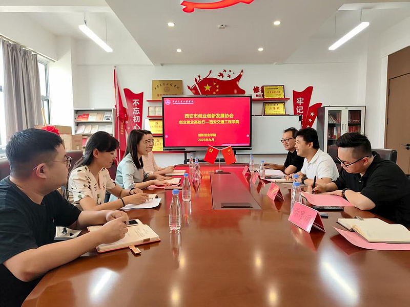 2025年9月9日,西安交通工程学院与西安市创业创新发展协会展开“创业就业高校行”交流活动。西安市创业创新发展协会会长董小泰、秘书长吴博、项目服务部部长杨时锟、协会宣传专员李思雨,以及西安交通工程学院理事会办公室主任兼创新创业学院院长千红、团委书记王小英和创新创业学院部分教师参与本次交流活动。双方就当前高校创新创业教育面临的挑战与机遇交换意见,并就后续合作方向达成共识,旨在进一步激发师生参与热情,提升项目质量,构建更系统、更高效的创新创业教育体系。
